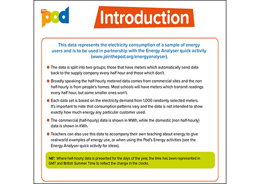 The data on this activity sheet represents the electricity consumption of a sample customer in 2012. You can use the data included on this activity sheet to run the Energy Analyser quick activity. You can download the Excel activity sheet on this page to get started.