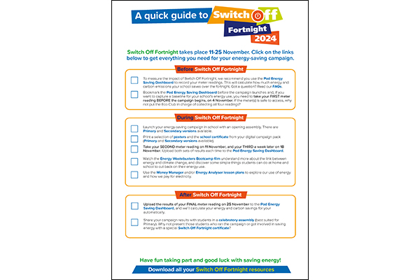The Switch Off Fortnight Primary Campaign Pack provides schools with assemblies, posters, certificates, and activities to help pupils save energy, measure their school’s impact, and celebrate achievements.