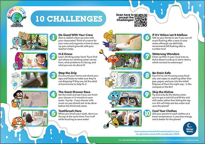 A vibrant poster featuring 10 fun and impactful water-saving challenges for children and teens to complete during Water Week. Perfect for classrooms or home use to inspire action and encourage young people to become Water Champions!